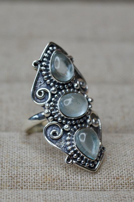 Artikelnummer: AN-13755Prachtige kwaliteit bohemian style ring met 3 Aquamarijn edelstenen in 925 Sterling Zilver.