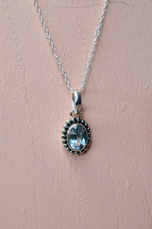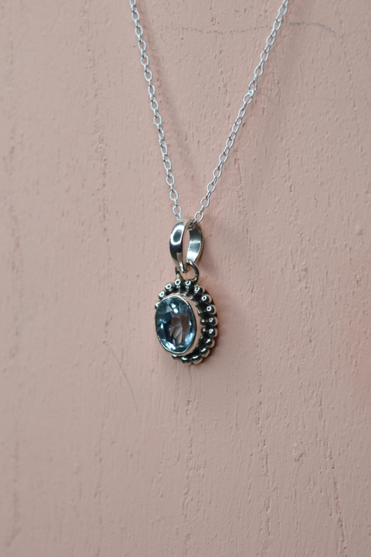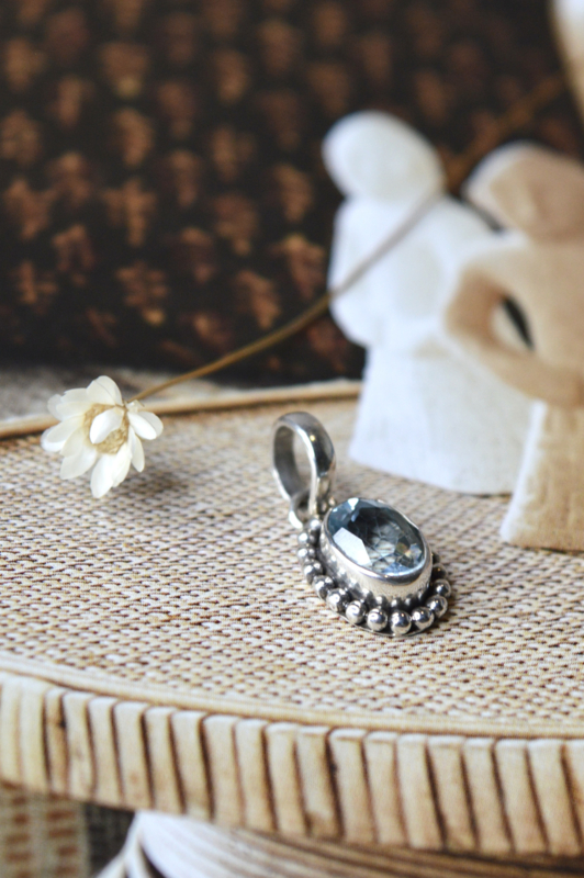 Aruna Blauw Topaas Hanger - Sterling ZilverHandgemaakt Bohemian stijl zilveren hanger met blauwe topaas edelsteen.