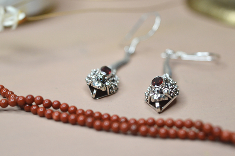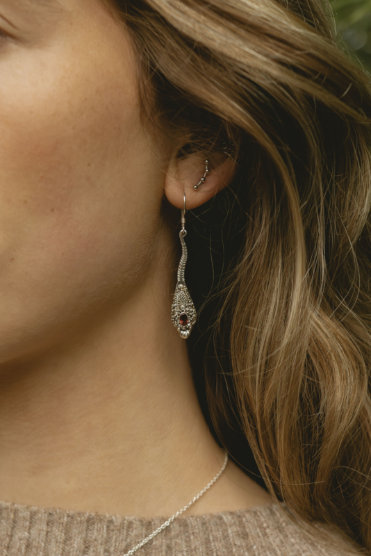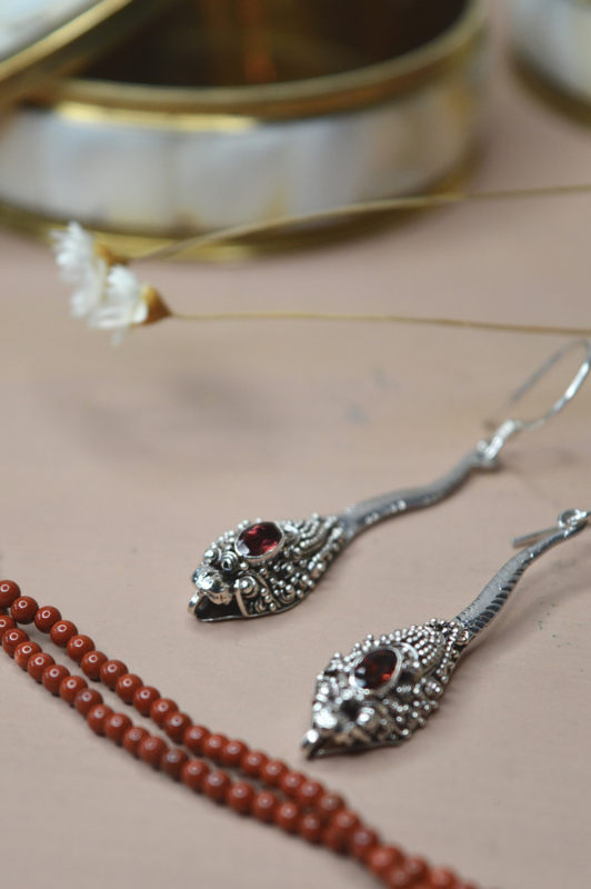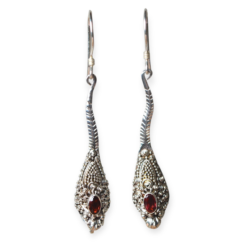In de Balinese mythologie staat de draak voor bescherming, transformatie en kracht. Deze langgerekte oorbellen, rijk bewerkt met traditioneel zilverwerk, doen denken aan een sierlijke drakenkop die een vurige granaatsteen bewaakt.