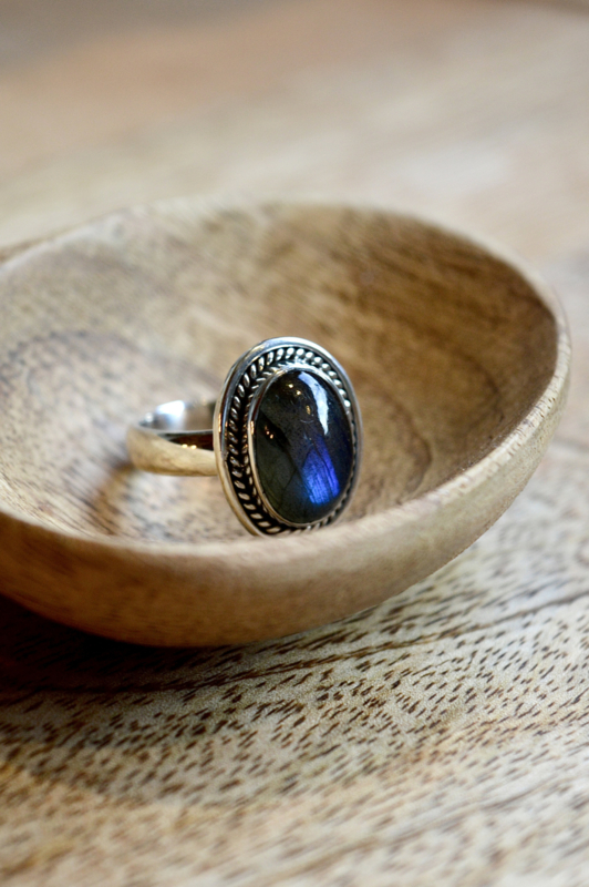 Handgemaakte sterling zilver Statement ring met een diepe, iriserende labradoriet in een India-boho setting. De verfijnde rand en rijke blauwe gloed geven de ring een koninklijke, spirituele uitstraling — elegant, krachtig en tijdloos.