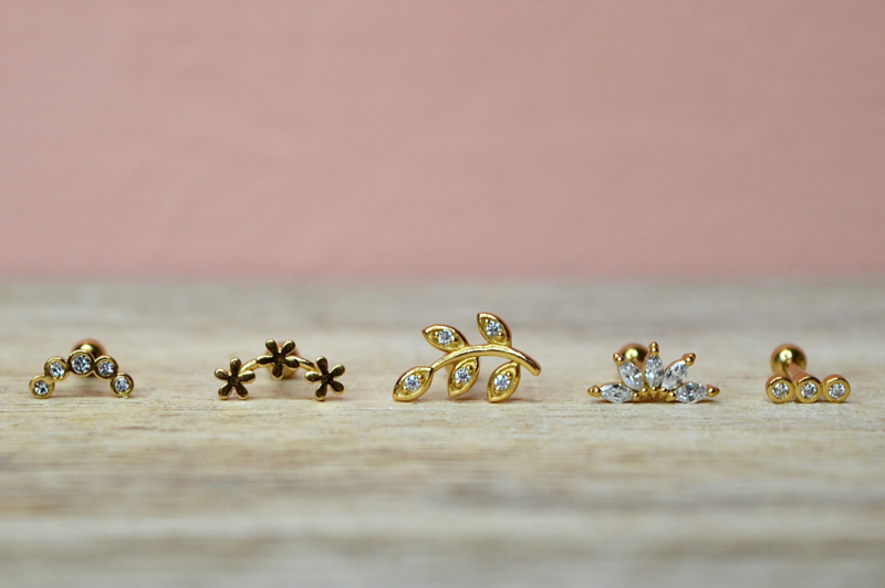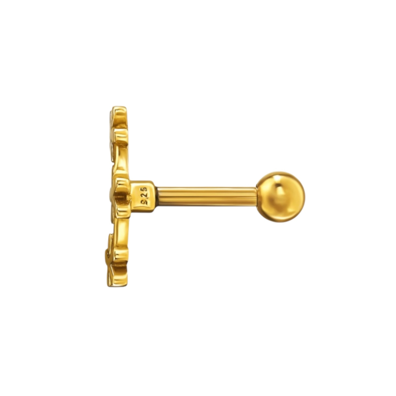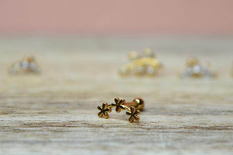 Verguld Sterling Zilver 'Triple Fower' Tragus, Helix, Bovenoor Piercing op 1.2x6mm (16G) 316 Chirurgisch Staal Vergulde Schroefdraad Barbell met 3mm Plain Ball