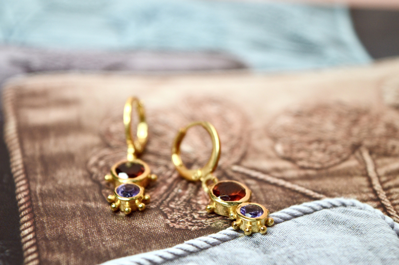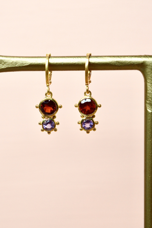 Steen: Deze oorbellen combineren warmrode granaat met zachtpaarse amethist voor een krachtig maar verfijnd kleurenspel..
