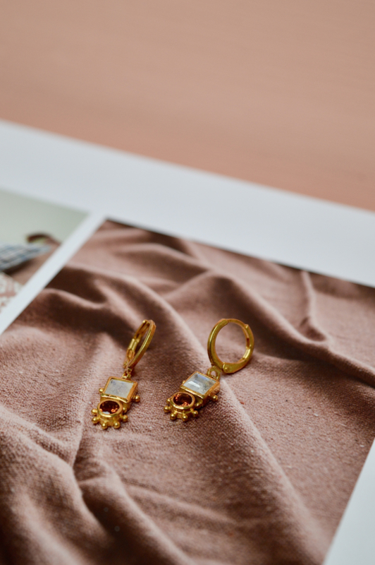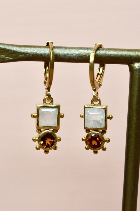 - Steen: Deze oorbellen combineren zachte maansteen met warmgekleurde citrien voor een frisse, vrouwelijke uitstraling.