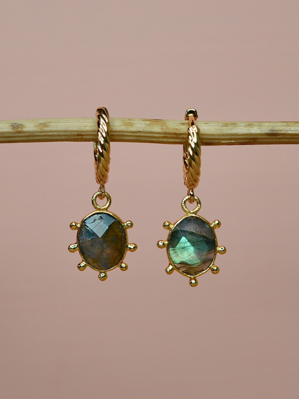 De gedraaide goudvergulde hoops geven het ontwerp een ambachtelijke uitstraling met een luxe touch. Labradoriet staat bekend als de steen van intuïtie, bescherming en transformatie – perfect voor vrouwen die hun innerlijke kracht willen laten stralen.