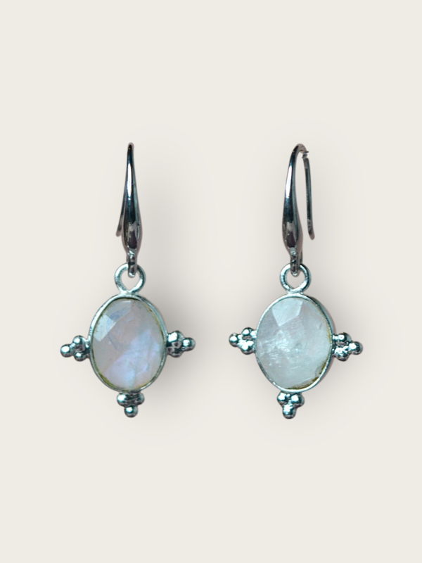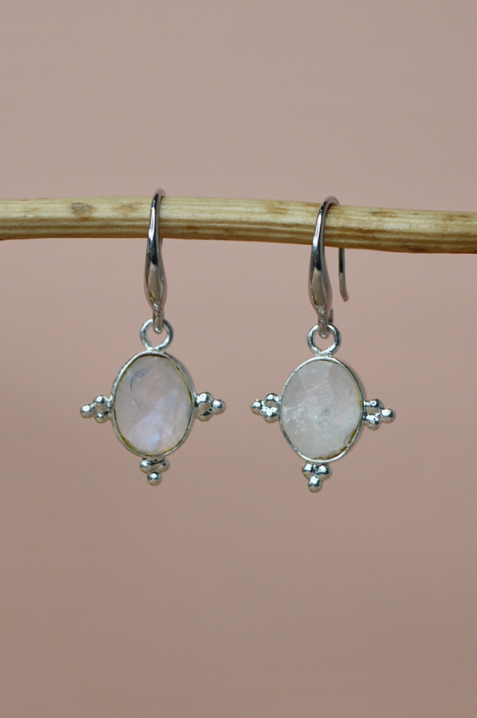 De Sona Rani oorbellen stralen een zachte, spirituele elegantie uit die rechtstreeks geïnspireerd is op de mystiek van India. De ovale, facetgeslepen maansteen vangt het licht met een subtiele parelmoerglans, terwijl de sierlijke zilverkleurige details rondom de steen doen denken aan traditionele Indiase zon- en bloemmotieven.