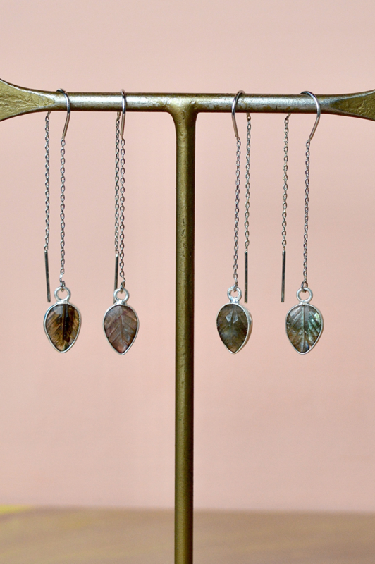 Artikelnummer: MJ-4011-LADe Mystic Leaf earchains zijn verfijnde oorsieraaden met een gesneden labradoriet blad hanger die subtiel schittert in blauw- en groentinten. De natuurlijke glans van de steen geeft elke beweging een mysterieuze, bijna magische uitstraling.