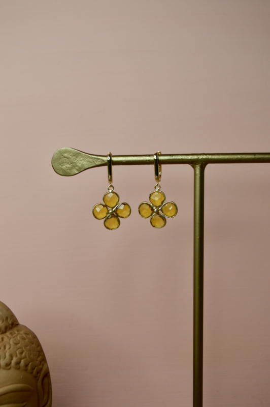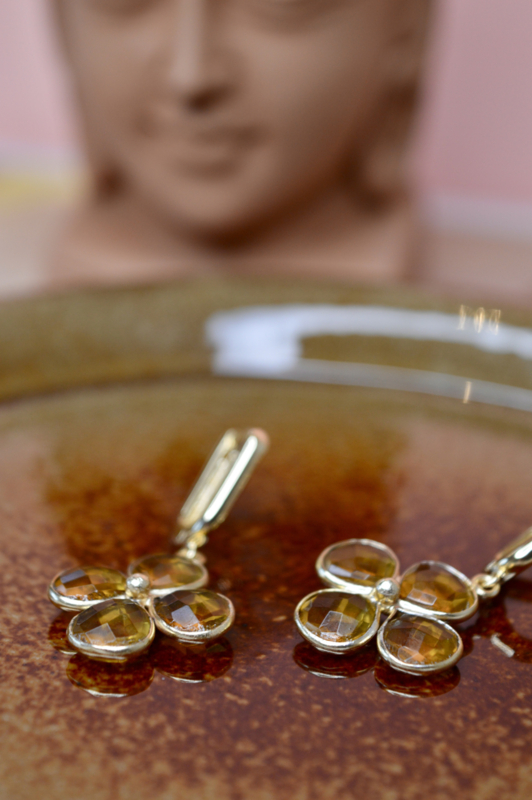 De Golden Bloom oorbellen stralen warmte en optimisme uit. Vier facetten van citrien vormen samen een bloemvormig design, gezet in gold plated brass. Een zonnig boho statement dat licht vangt bij elke beweging en moeiteloos elegant blijft.