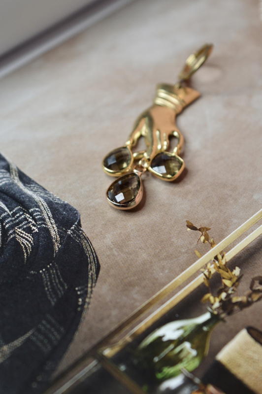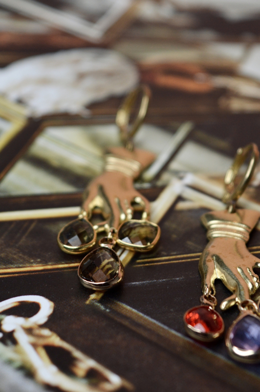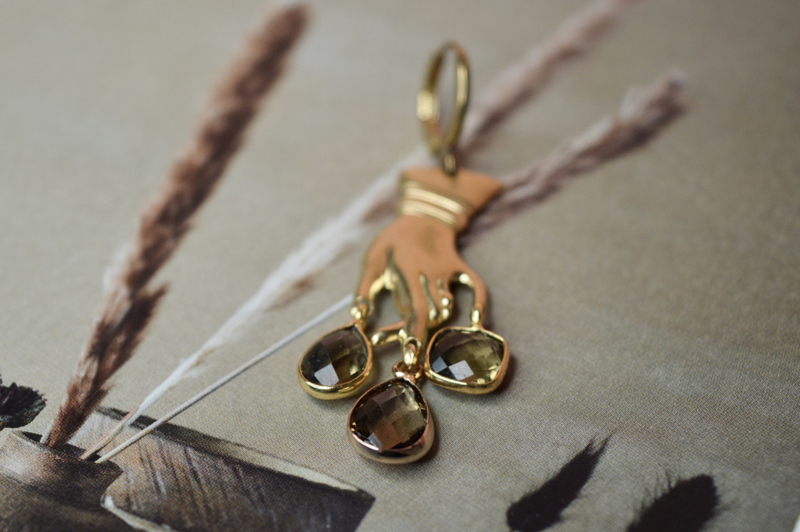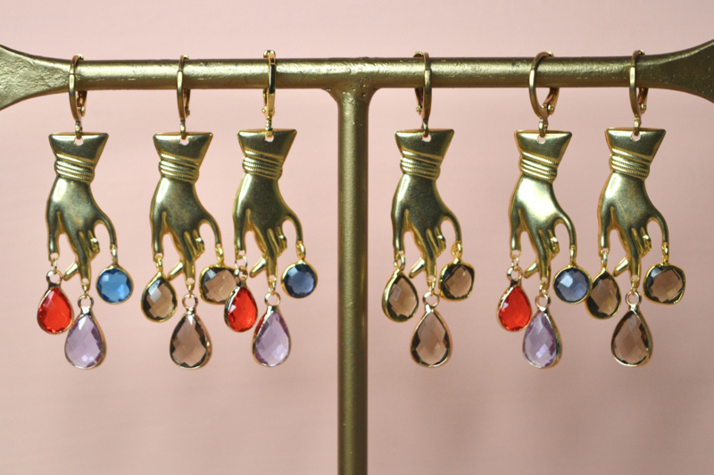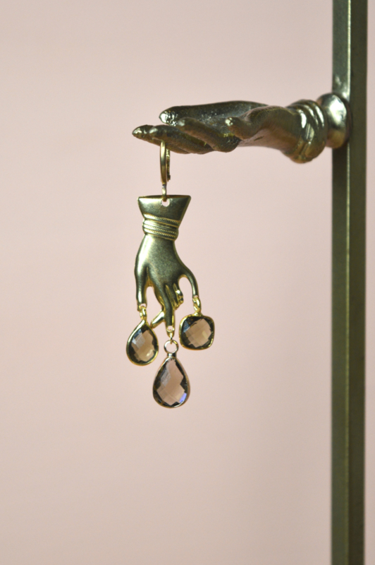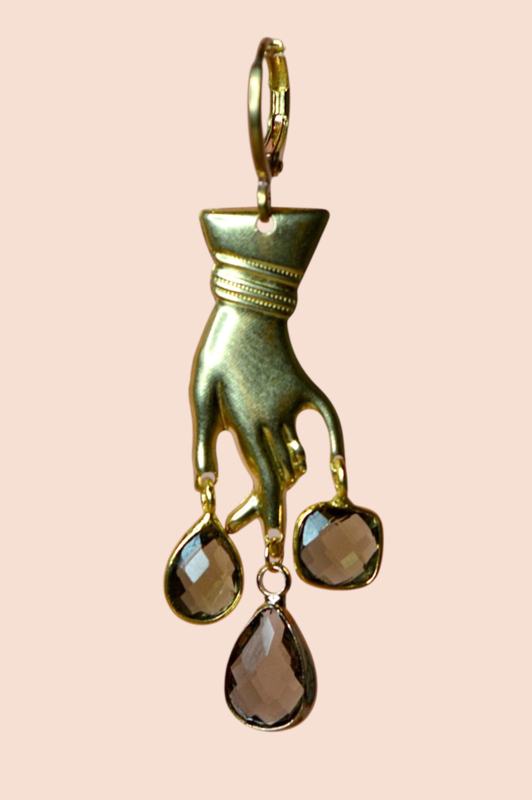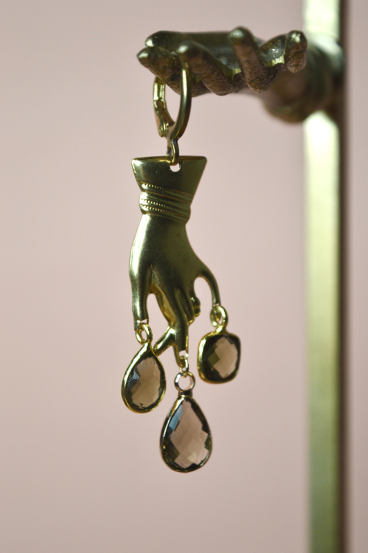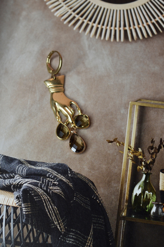 De Hand of Fortune single earring is een krachtig statement met een mystieke boho uitstraling. De gedetailleerde brass hand symboliseert bescherming, intuïtie en creatiekracht. Aan de vingers hangen drie fonkelende glazen bedels die zacht bewegen en het licht vangen bij elke stap.
