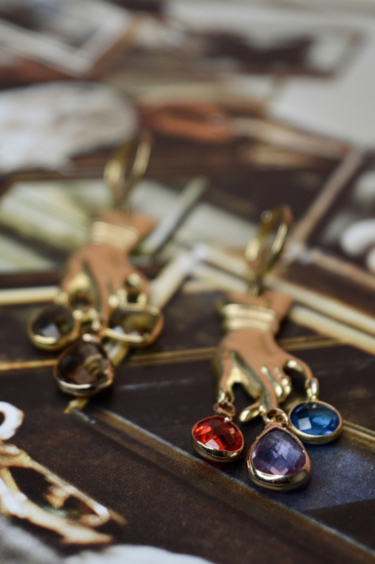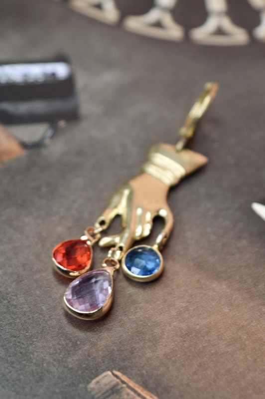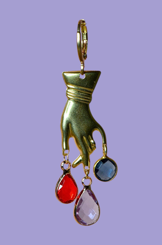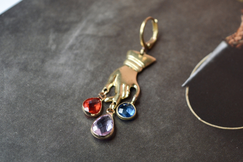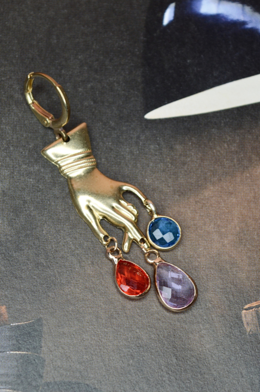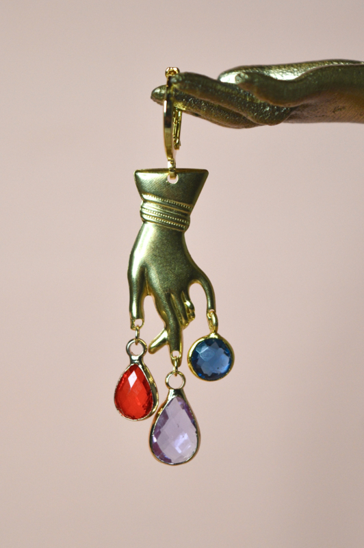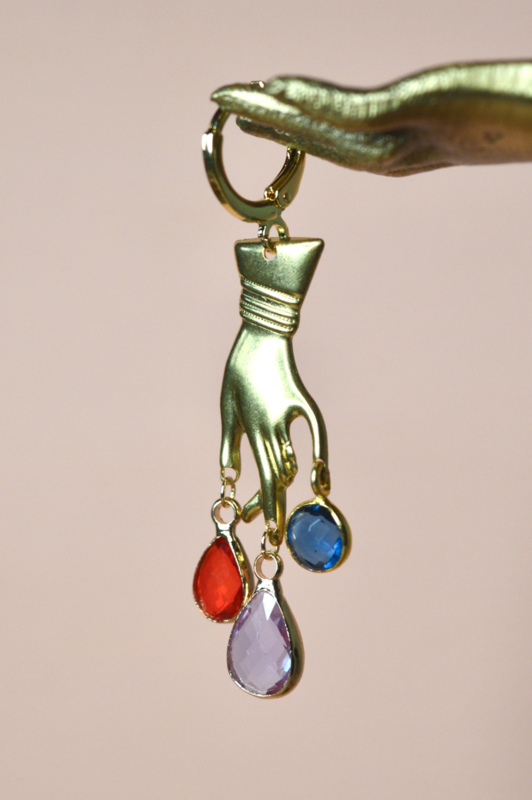 De Hand of Fortune single earring is een krachtig statement met een mystieke boho uitstraling. De gedetailleerde brass hand symboliseert bescherming, intuïtie en creatiekracht. Aan de vingers hangen drie fonkelende glazen bedels die zacht bewegen en het licht vangen bij elke stap.