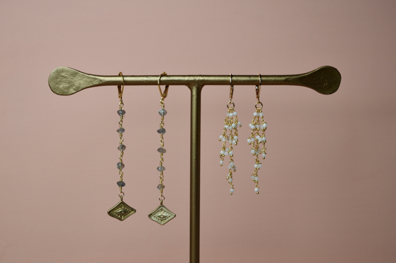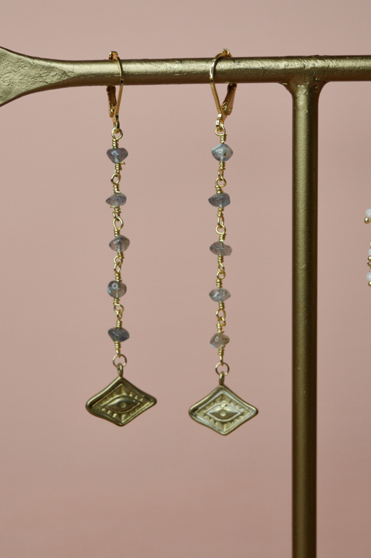 De labradoriet vangt het licht subtiel met zijn kenmerkende blauw-groene gloed en geeft elke beweging een magische uitstraling. De warme goudtint van het verguld brass vormt een prachtig contrast met de koele schakeringen van de steen, wat deze oorbellen een uitgesproken boho-luxe karakter geeft.