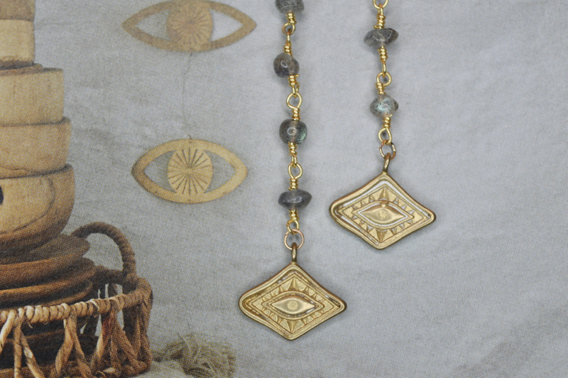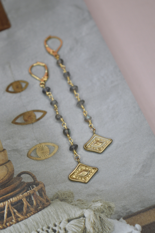 De Lunar Eye oorbellen zijn een krachtig en mystiek sieraad waarin symboliek en verfijning samenkomen. De lange, elegante lijn van met de hand geregen labradoriet kralen leidt naar een gedetailleerde brass ooghanger — een eeuwenoud symbool van bescherming, intuïtie en innerlijke wijsheid.