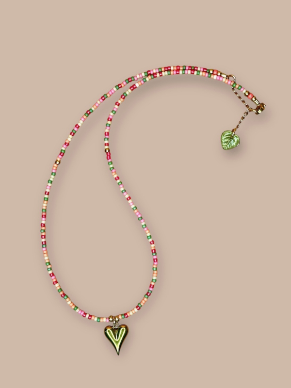 Deze verfijnde handgemaakte ketting is een speelse mix van zachte pastelkleuren en warme accenten. De fijne kraaltjes in roze, groen en crème tinten vormen samen een licht geheel, subtiel afgewerkt met een glanzende rvs hartbedel als liefdevol middelpunt. De ketting draagt luchtig en elegant en is perfect om solo te dragen of te layeren met andere bohemian sieraden. Een charmant sieraad dat moeiteloos een vleugje vrijheid, zachtheid en vrouwelijke energie toevoegt aan elke look. 💛