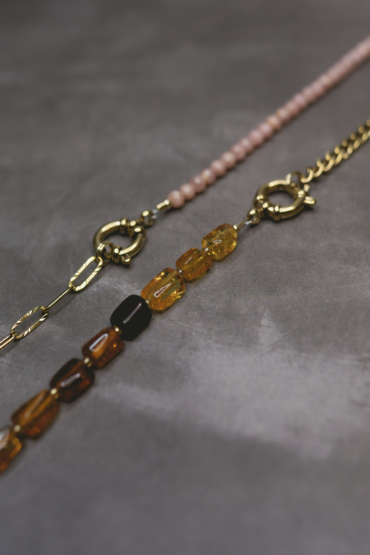 Amber Duo Design Ketting - Stainless Steel GoudDeze leuke Duo Design-ketting is multifunctioneel: haal de schakel eraf en draag hem als een prachtige armband met edelsteen kraaltjes.∙ Materiaal: Roestvrijstaal