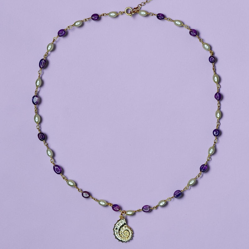 Amethist staat bekend als een steen van rust, balans en intuïtie, terwijl parels symbool staan voor puurheid en natuurlijke schoonheid. Samen vormen ze een lichte, elegante ketting die perfect past bij een zomerse outfit of een subtiele layered look.