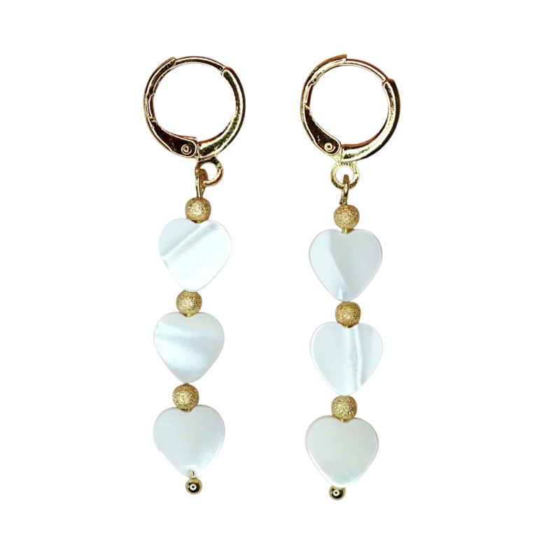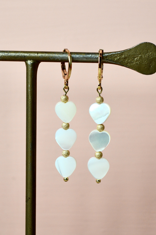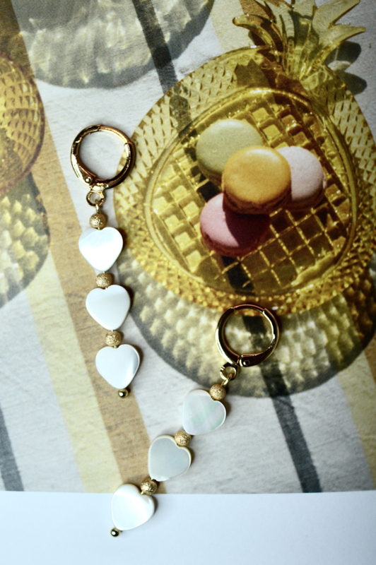 De zachte glans van de hartjes vangt het licht op een dromerige manier, terwijl de kleine gouden accenten zorgen voor een warme, luxe uitstraling. De speelse lengte en het ritme van de vormen geven beweging en maken deze oorbellen perfect voor zowel everyday chic als een romantische avondlook.
