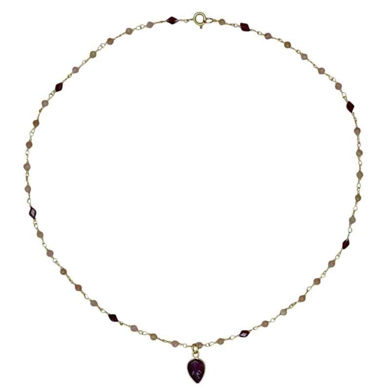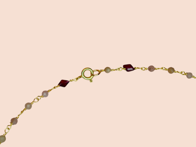 De combinatie van warme goudtinten, zachte roze nuances en de rijke kleur van granaat zorgt voor een harmonieus geheel. Perfect om solo te dragen of te combineren met andere fijne kettingen voor een gelaagde look.