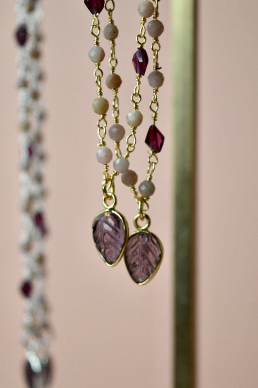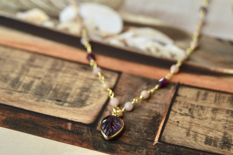 Amethyst Leaf Necklace ademt een zachte, warme elegantie. De fijne ketting met subtiele kralen van granaat en perzik maansteen wordt verrijkt door een gesneden amethist hanger in bladvorm – een klein kunstwerkje!