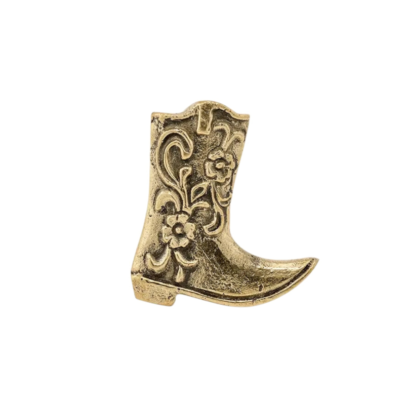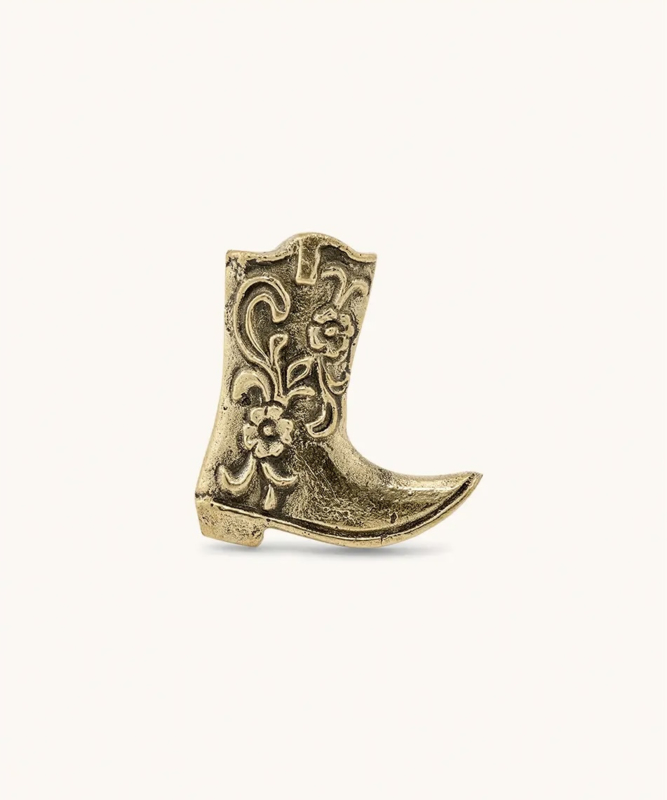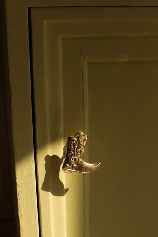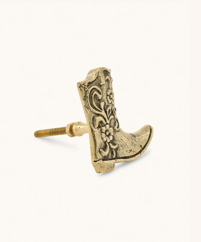 Jihaa! Geef je meubels een vleugje Zuidwestelijke charme met de Dallas Cowboy Laars Knop. Deze decoratieve messing handgreep is een knipoog naar het wilde Westen, perfect om een vleugje grensflair toe te voegen aan je dressoir, kasten of zelfs deuren. Elke knop is zorgvuldig met de hand gemaakt door ons team van ambachtslieden in India, wat zorgt dat elk stuk zijn eigen unieke karakter en gedetailleerde afwerking heeft die de geest van de cowboy laars vangt.