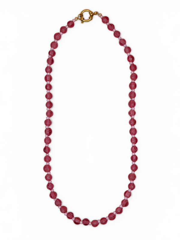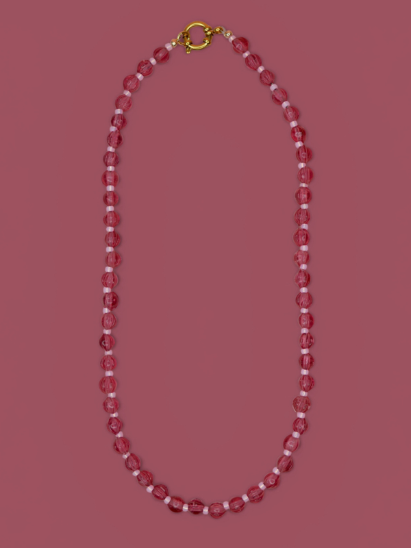 Zomerse ketting met roze transparante gesneden kralen en zachte contrastdetails van lichtroze Miyuki kralen. Speels en kleurrijk, zonder te overheersen. Een easy piece dat elke outfit meteen warmer en levendiger maakt.