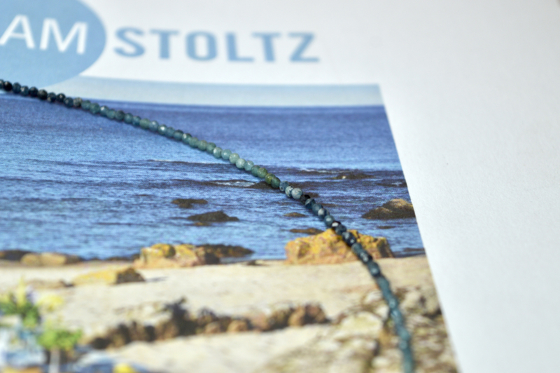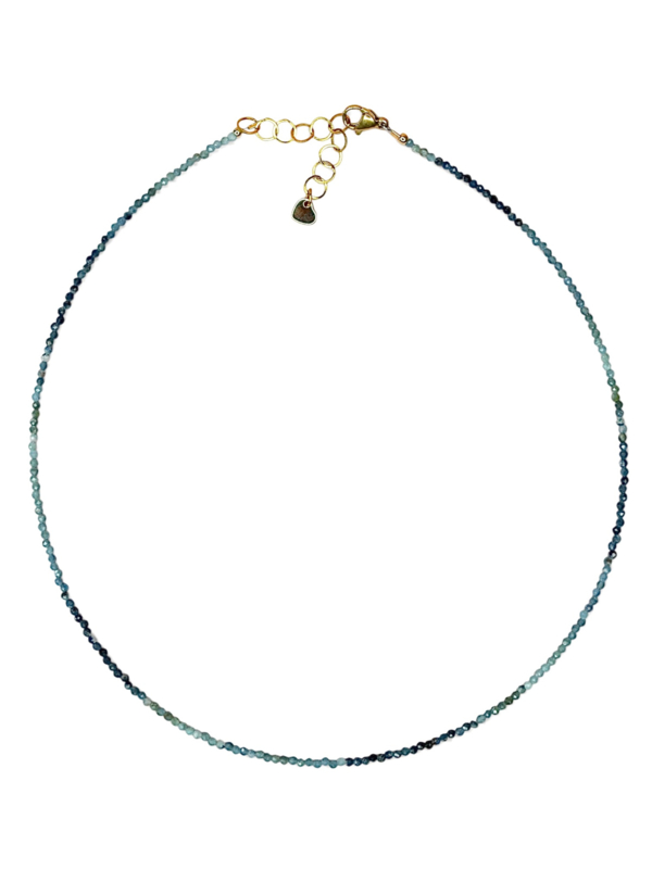 Artikelnummer: LT-1004-BTFijne korte La Tarifa Lagoon ketting, handgemaakt met kleine (2 mm) blauwgroene facetgeslepen toermalijn kralen die doet denken aan helder zeewater. Fris, licht en perfect voor zonnige dagen — een subtiel kleuraccent met mooie glans dat meteen opvalt zonder te overheersen.