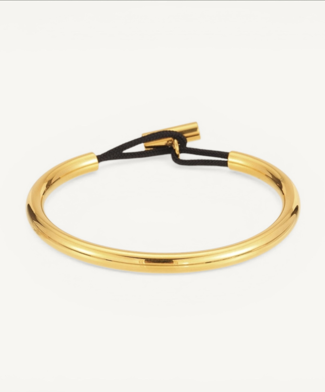 Strakke, goudkleurige armband met een minimal design en T-type sluiting. De combinatie van het gladde metaal en het zwarte koord geeft een moderne, krachtige uitstraling. Draag ‘m solo voor een clean statement of combineer met meerdere armbanden.