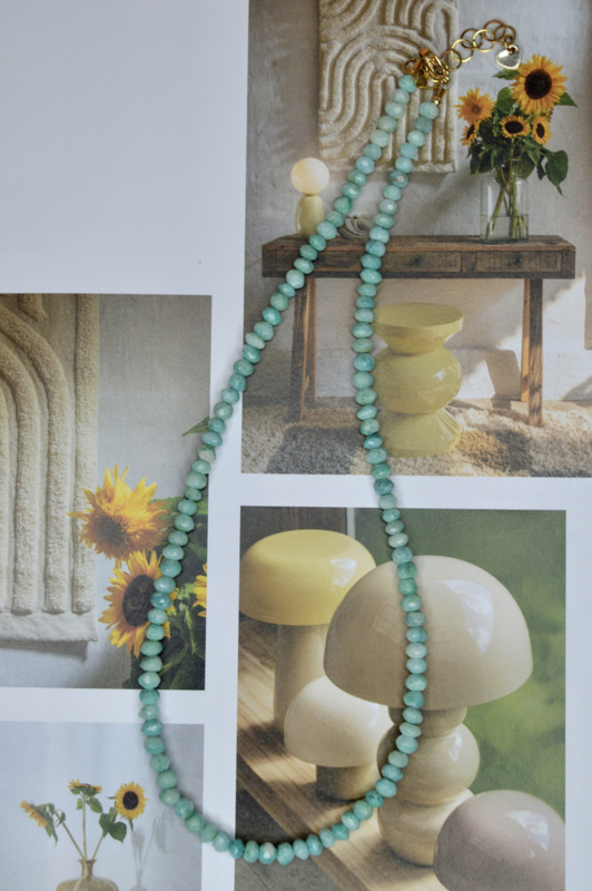Verfijnde La Tarifa Meera Amazonite ketting met zachte, groenblauwe amazoniet kralen. De frisse tint en subtiele glans geven het sieraad een rustige, luxe uitstraling. Elegant in zijn eenvoud en perfect om solo te dragen of te combineren in een gelaagde look.
