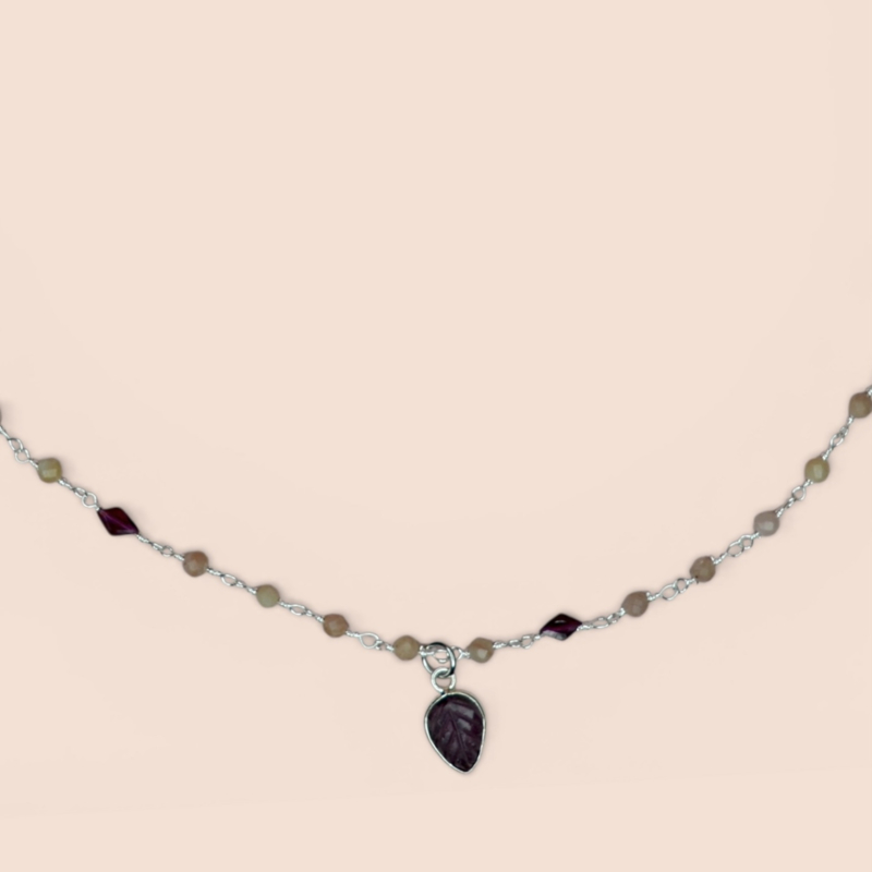 Amethist Mystic Leaf Ketting - Silver PlatedAmethyst Leaf Necklace ademt een zachte, warme elegantie. De fijne ketting met subtiele kralen van granaat en perzik maansteen wordt verrijkt door een gesneden amethist hanger in bladvorm – een klein kunstwerkje!De combinatie…