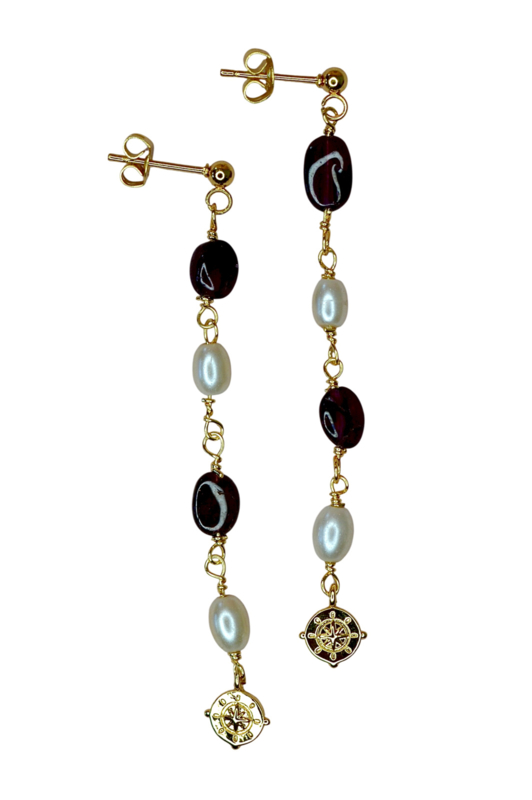 Compass Granaat en Parel Oorstekers - Gold PlatedDe Compass Earrings brengen elegantie en avontuur samen in één verfijnd ontwerp. Deze oorbellen zijn vervaardigd van gold plated materiaal en gecombineerd met diepe, warme granaatstenen en zachte parelaccenten.De lange,…